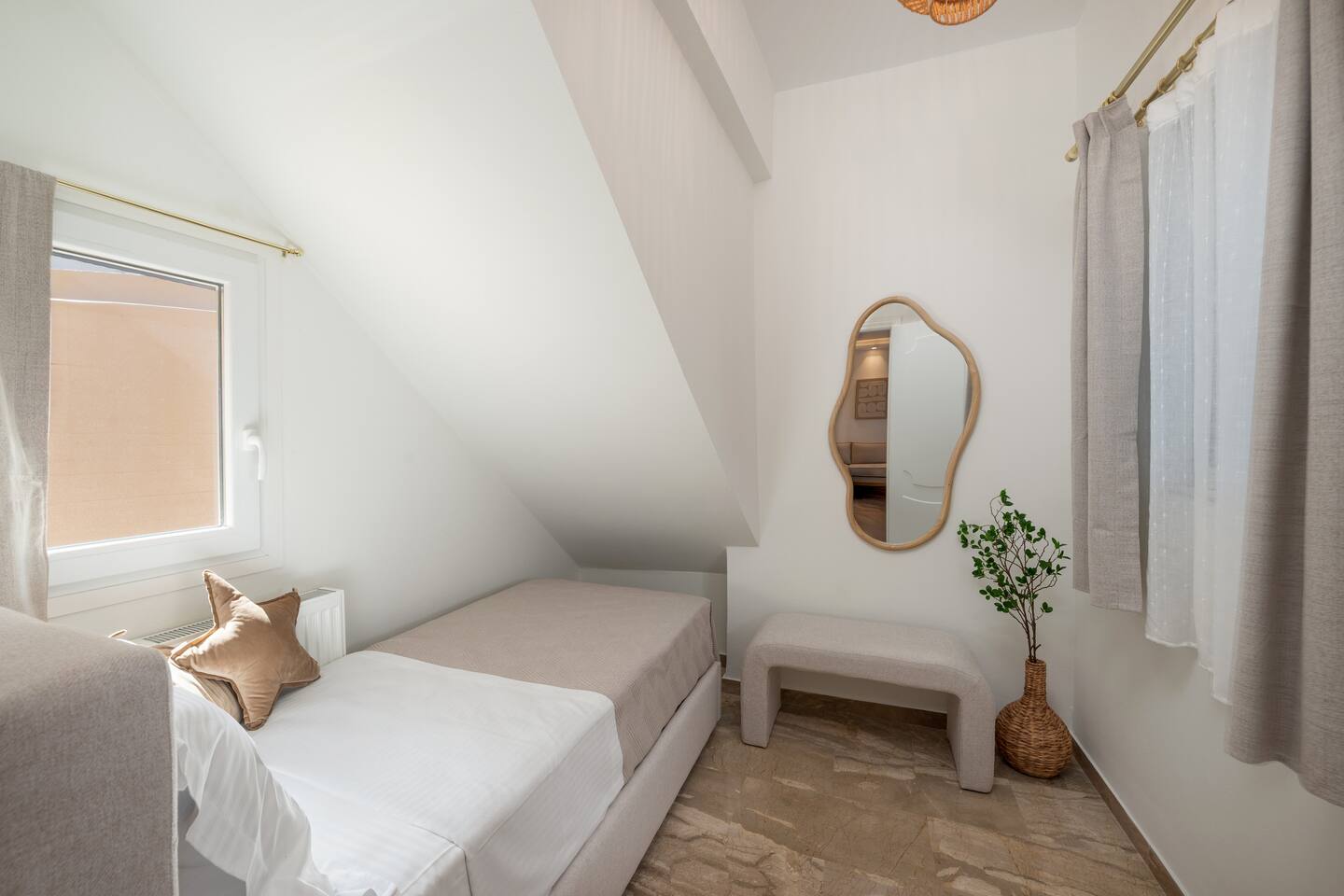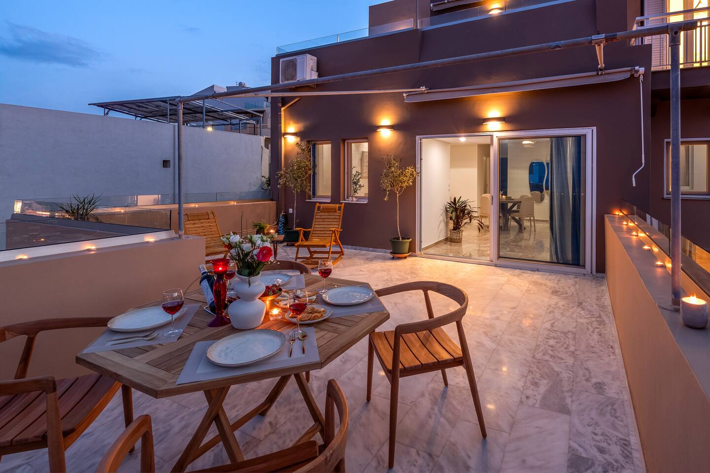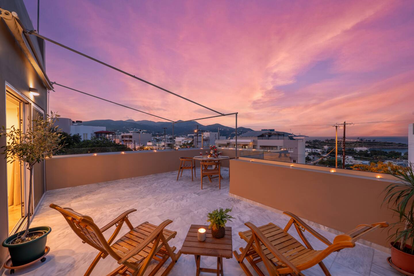📍 Prime Location Perfectly situated to help you explore: The charming town of Agios Nikolaos Nearby attractions and natural beauty of Eastern Crete The organized beach of Ammoudi, just a 5-minute walk away Within walking distance you'll find: Bakeries, supermarkets, cafés, and restaurants Hospital, pharmacy, central bus stop, and taxi rank Charging station for electric vehicles The area is known for its crystal-clear waters, traditional tavernas, and relaxed atmosphere—perfect for soaking up the Mediterranean sun. 🛋️ Living Room The bright, spacious, and modern living room features a large corner sofa that invites you to relax or unwind after a day of exploring. 43" Smart TV with Netflix, Cosmote TV, Disney Plus, and Vodafone TV High-speed Wi-Fi throughout the apartment Board games and a water filtration system Dining table for 4, ideal for shared meals and cozy gatherings 🛏️ Bedroom 1 Enjoy a peaceful and restful sleep in a spacious King Size bed (1.80 × 2.00), perfect for moments of total relaxation. The sleek, minimalist design of the room enhances comfort and tranquility. It features ample storage space, a 32" TV, air conditioning, and a safe for your personal belongings. 🛏️ Bedroom 2 This cozy bedroom includes a comfortable single bed (0.90 × 2.00), ideal for children or an extra guest. The space offers a multifunctional open wardrobe that keeps your belongings organized and easily accessible, along with a modern vertical ventilation unit for added comfort. 🍽️ Kitchen Enjoy your meals in this bright, private kitchen, which opens to an independent dining area. It is fully equipped with all modern appliances and conveniences. 🛁 Bathroom The spacious bathroom with a built-in shower is the perfect place to rejuvenate and unwind after a full day. It features a modern design and comes fully stocked with all essential toiletries and hygiene items. 🌿 Outdoor Areas Soak up the sun and enjoy the panoramic views from the spacious, sunlit terrace. Relax in the comfortable outdoor furniture with your morning coffee or unwind with a glass of wine under the stars. The outdoor area includes: A dining table for 4 for al fresco meals Comfortable lounge chairs with a side table A stylish hanging egg chair for peaceful moments A large fixed awning to provide shade during warm days In the backyard, accessible from both the kitchen and the main bedroom, you’ll find: A second outdoor dining table for 4 Two comfortable sun loungers A small table, perfect for enjoying drinks or snacks